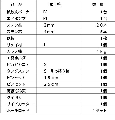 バーナー・エアポンプからガラス、基本的な工具まで揃っています。